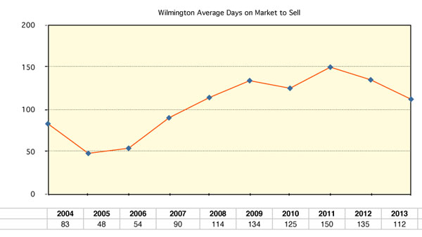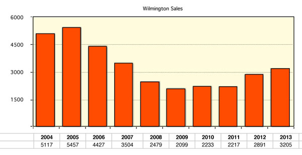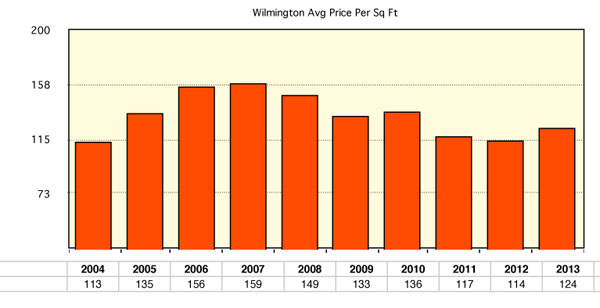 Sales in Wilmington have been level for years but took a big bounce in 2012 and continued to increase in 2013. Average sold prices were up slightly, as were the average price per square foot. Days on market and inventory both fell. All good signs!
